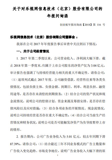 乐视网遭深交所问询:是否可能净资产为负致暂