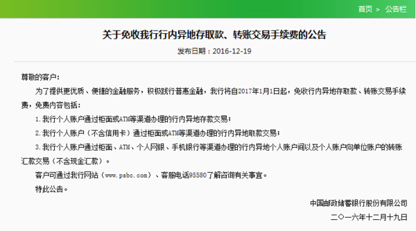 同行异地取款手续费 2016邮政储蓄同行异地转