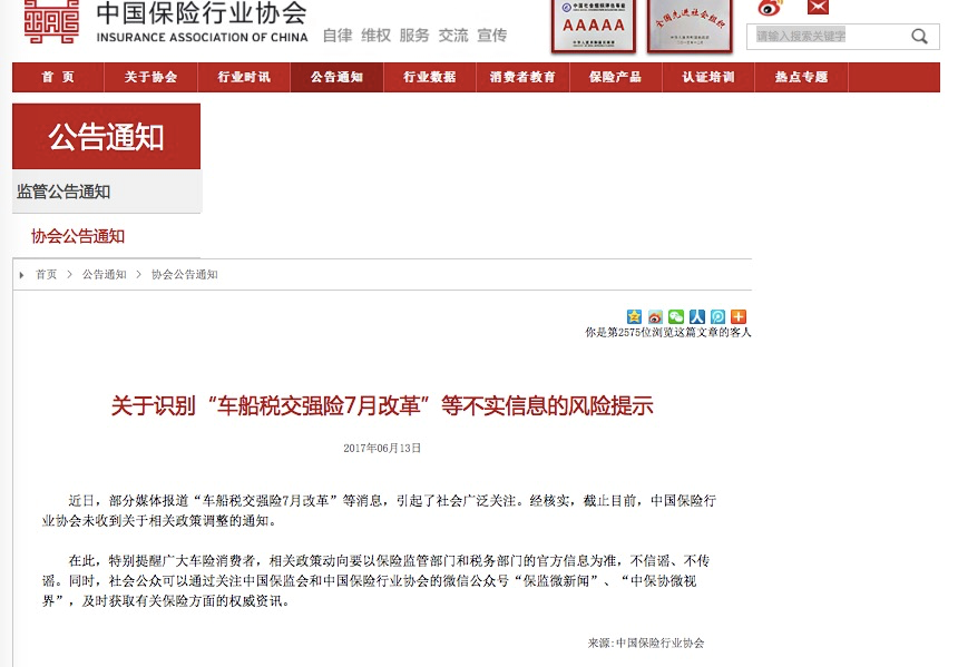 中保协辟谣: 车船税交强险7月改革 消息不实|交