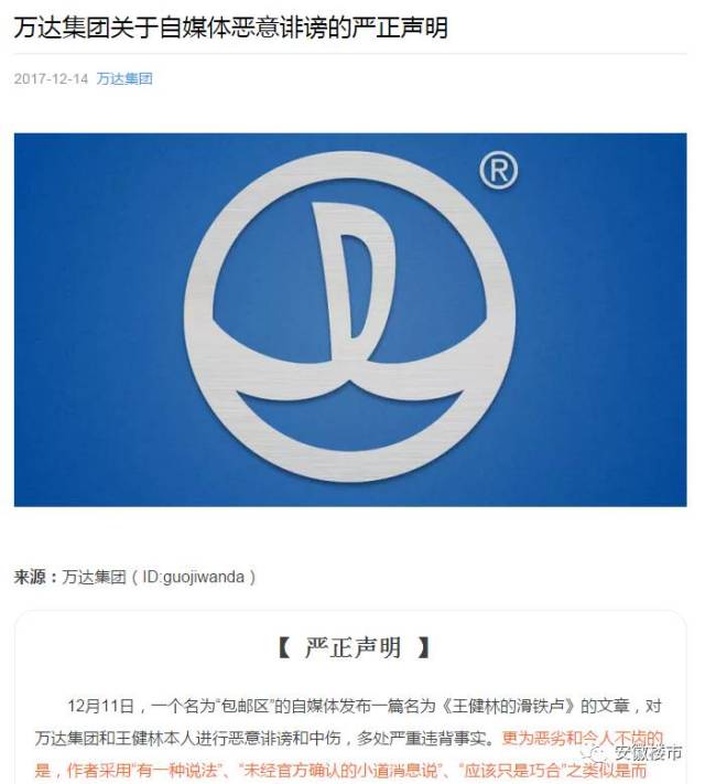 了!万达集团针对恶意诽谤发布严正声明;安徽宣