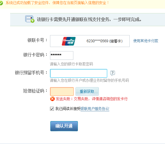 银行卡开通银联在线支付功能短信总是发送失败
