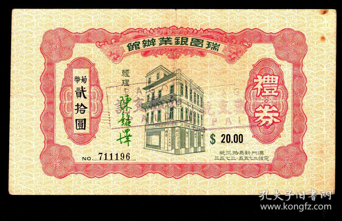 [H-50]澳门新马路3号瑞昌银业办馆礼券\/葡币20