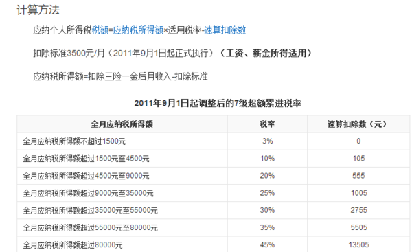 [最佳答案] 以每月收入额减除费用扣除标准(从2011年9月1日起,扣除标准为3500元)减去税前扣除的五险一金,余额为应纳税所得额,再按税率表适用七级超额累进税率(3%至45%)计缴个人所得税。 五险费一金是指养老保险、医疗保费、失业保险、工作保险、生育保险和住房公积金 应纳税额=(工资薪金所得 -“五险一金”-扣除数[3500])×适用税率-速算扣除数 5600- 【300(五险一金)】 -3500(扣除数)=1800*10%-105=75(税) 5600-3500=2100*10%-105=10