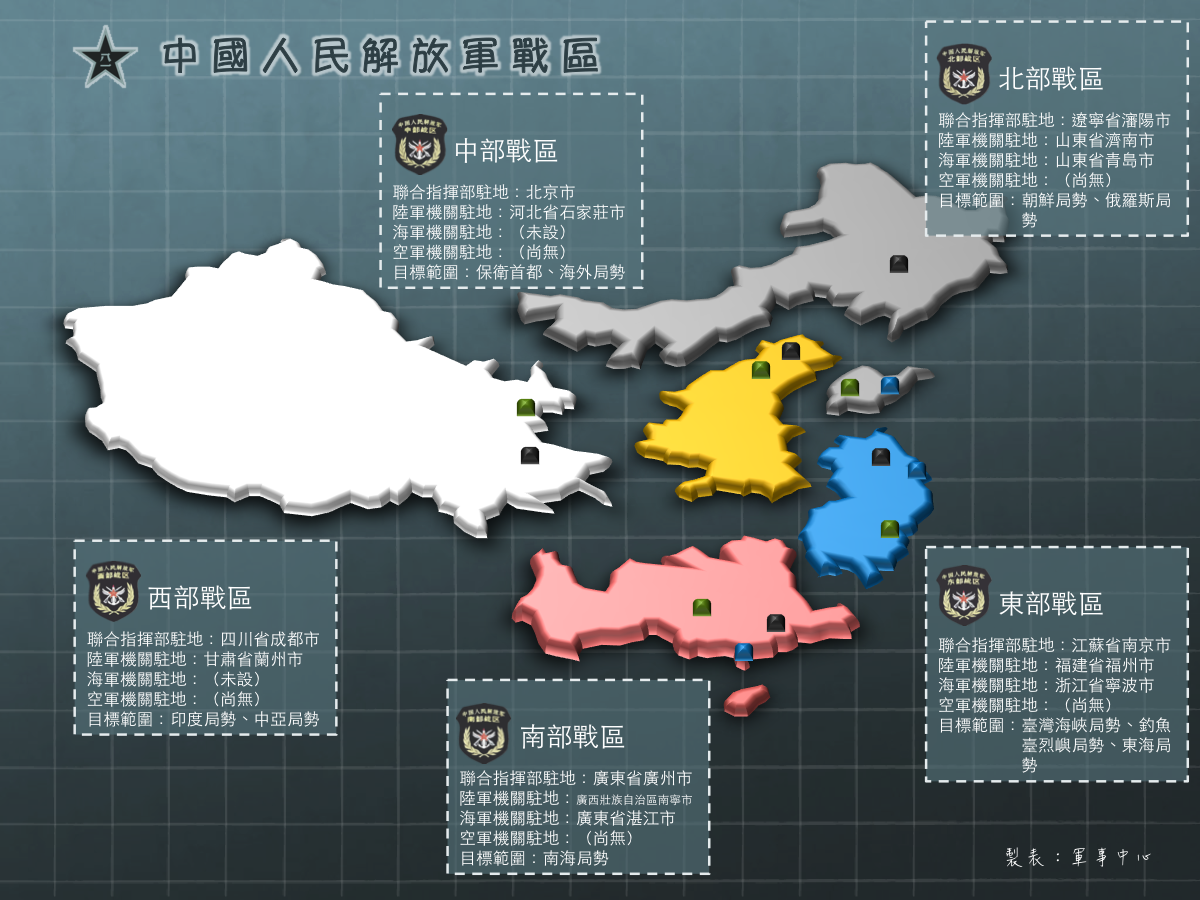 中国人民解放军东部战区、中国人民解放军南部战区、中国人民解放军西部战区、中国人民解放军北部战区、中国人民解放军中部战区。 中国有几大