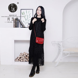 月芝猫2018冬季新款黑色针织蕾丝打底连衣裙