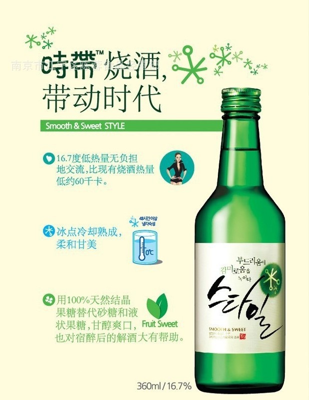 简介:韩国烧酒(Soju)是一种酒精饮料。主要的原料是大米,通常还配以小麦、大麦或者甘薯等。韩国烧酒颜色透明,酒
