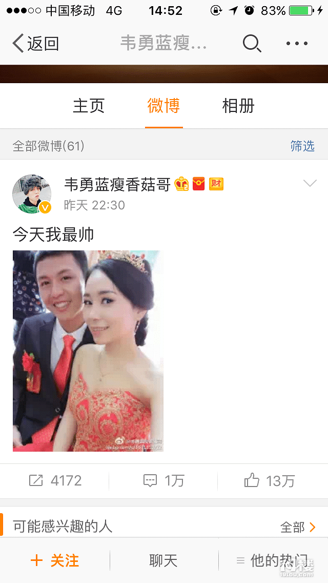 蓝瘦香菇哥结婚 韦勇微博晒图发文:今天我