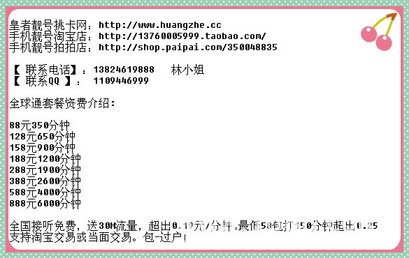 [最佳答案] 全球通新开户号段 每月月初有更新放号出来,选择比较多,老号段138、139居多,目前其他品牌都可以转换升级为全球通 ,所以所有移动号段都可以实现成为全球通。“全球通”是中国移动通信的旗舰品牌,知名度高,品牌形象稳健,拥有众多的高端客户。它已经成为国内网络覆盖最广泛、国际漫游国家和地区最多、功能最为完善的移动信息服务品牌。