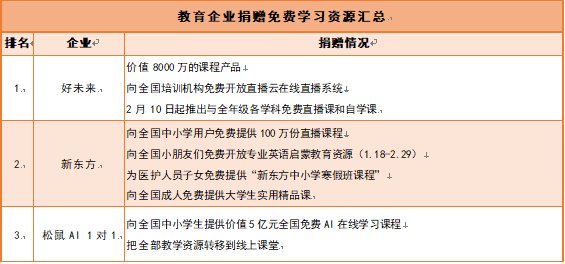 此外,向谁学习、精英教育、麦基教育等企业都捐赠了价值2000多万元的现场或在线课程。雪霸君、阿凡提、腾讯企鹅咨询和家庭作业等企业为不同地区的中小学生提供免费的寒假或春季课程资源。尚德、小箱技术、流畅性、VIPKID等企业提供不同类型的课程资源,包括成人教育、学生家长、大学生等