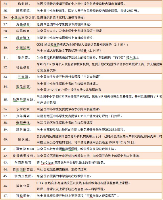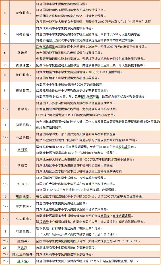 网易有道:1月24日,网易有道精品课程向武汉市中小学生免费提供寒假在线课程。1月26日,该企业将支持范围扩大至湖北省所有地区。1月29日,支持范围再次从湖北省扩大到全国中小学生。学生可以申请相应年级的免费春季学期课程。网易有道同时还追加了500万元的全勤奖学金