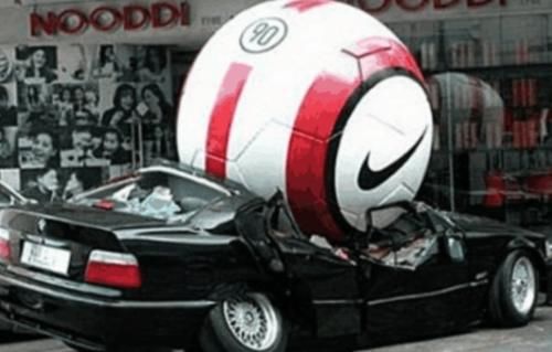 第三个,看着方板是模型,应该是十几年前的老爷车,这是在一个楼下,突然从天上掉下来一个“足球”砸在车顶上,车顶马上就塌了,幸好车里没人,没人受了什么损伤,但是面对这样的损失车主估计都快哭哭啼啼了