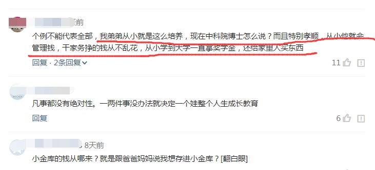 另一群网民认为给孩子钱做家务会让他们变得“以利润为导向”。看着金钱无所不在,他们不把家务当成自己的责任,不会帮助父母,最终可能导致孩子的孝顺?< br>