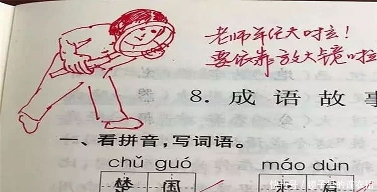 可以看出这个学生写的字有点小。然后老师在试卷上画了一个女孩。她看到手里拿着这个超大放大镜。然后她弯下腰仔细观察试卷上的单词。最后,她在试卷上写道,老师太老了,不能依靠放大镜来看你写的字。老师觉得太瘦了。如果你有这样的老师,你会一整天都开心吗?
