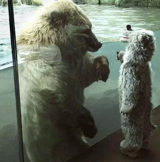 一个失去幼崽的北极熊妈妈和一个扮演北极熊幼崽的孩子正互相看着对方(我编造了失去幼崽的故事)