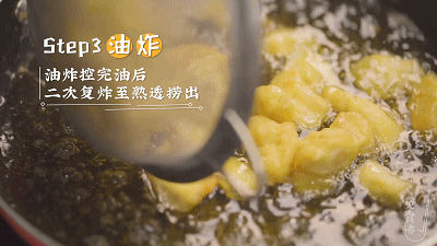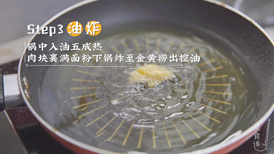 步骤4锅中加入50%的油,用面粉覆盖肉块,放入锅中,煎至金黄色,取出并控制油量控油后,再次油炸至成熟,取出。