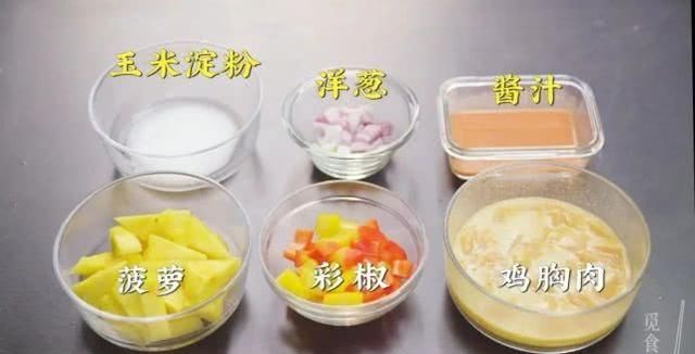 食品制备:鸡胸肉、洋葱、菠萝半、彩椒、鸡蛋1、玉米淀粉(生粉)、盐、胡椒、鲜味、白糖、番茄酱、醋、料酒