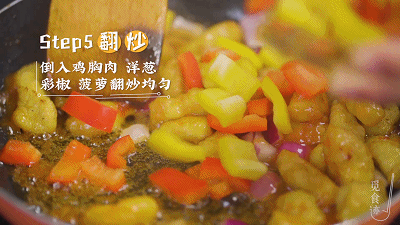 步骤7最后加入菠萝片和彩色胡椒片,继续翻炒均匀。取出前加入新鲜的调味料和少许盐调味,然后取出。