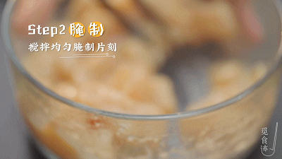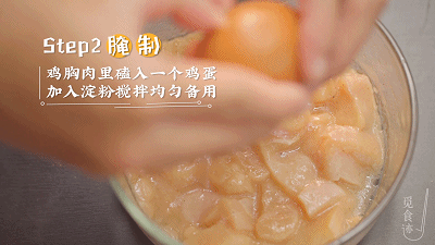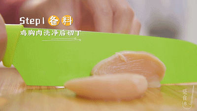 步骤2:将买来的鸡胸肉切成小块,加入少量的油、盐、淀粉、料酒和白胡椒腌制一会儿