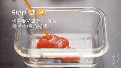 步骤5倒入番茄酱,加入水、淀粉、糖和白醋,煮沸成糊状