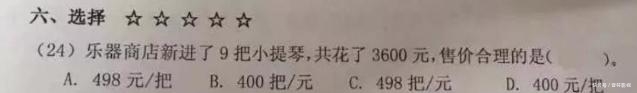 开心后,陈丽拿出试卷,和女儿一起分析了错误的问题。他发现扣除的两分是选择题。问题是:乐器商店花了3600英镑买了9把小提琴。合理的售价是多少?