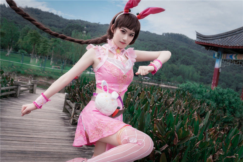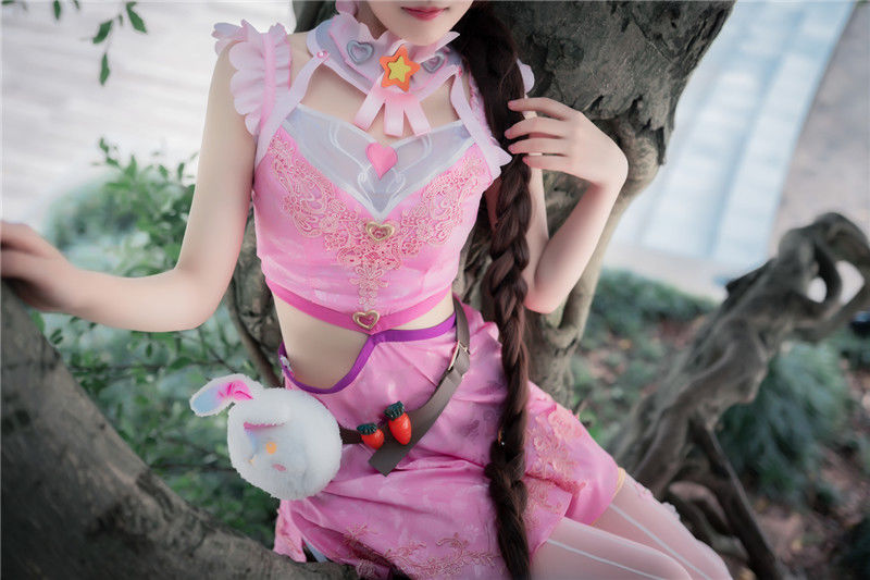 小舞服装有露腰的特点,但不是全部露在外面,而是挡住肚脐,只露出腰部左右两边。经过一些阻挡,它变得更有吸引力,但这也需要高水平的coser这个可爱的小妹妹一点也不害怕。当她展示她的腰部时,她展示她的腰部。腰部毛绒绒的小兔子包也是一个装饰品,可爱的小舞蹈形象出现了。