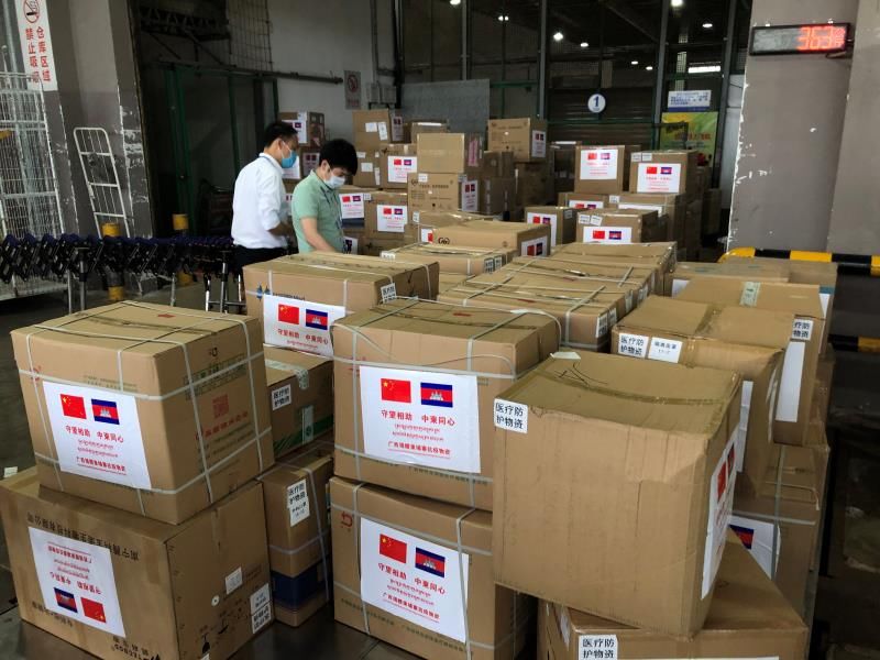 随同包机抵达金边,随同抵达的还有N95防护口罩、医用外科口罩、医用一次性防护服、红外线温度枪以及柬埔寨急需的其他抗疫医疗物资包装货物的纸箱上印有中国和柬埔寨的国旗,以及用中文和柬埔寨语写的“中国和柬埔寨相互帮助,团结一致”的字样。