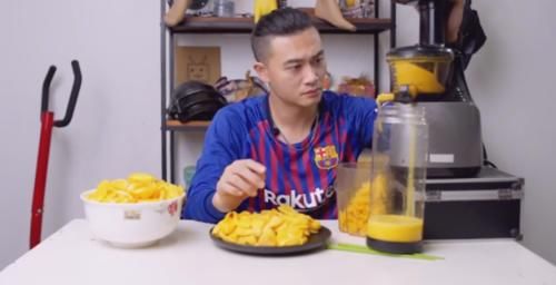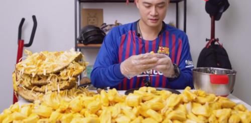 剥菠萝蜜实际上是一个庞大的工程,因为手特别粘,所以平时吃饭时每个人都必须戴手套剥它。这样,就更方便了。几乎所有的果肉都被去皮后,放入碗中,在榨汁机中使用,取出里面的果核,然后将果肉放入榨汁机中。这样,果汁就被挤出来了。主人花了将近10分钟挤出所有的果肉。