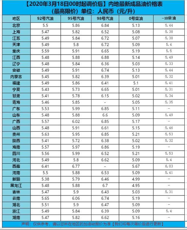 国内油价调整后,加油站汽油、柴油最新限价为:黑龙江地区92 #汽油5.48元/升,95 #汽油5.88元/升,98 #汽油6.7元/升,0 #柴油4.95元/升。在湖北,92号汽油每升5.51元,95号汽油每升5.9元,98号汽油每升6.47元,0号柴油每升5.09元。在云南,92号汽油每升5.65元,95号汽油每升6.06元,98号汽油每升6.74元,0号柴油每升5.19元。其他地区汽油和柴油的零售价格可参考上图。此价格仅供参考,以当地加油站的实际价格为准。