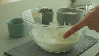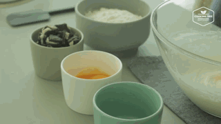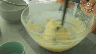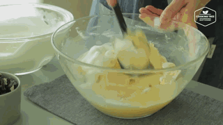 蛋白混合后可分成3-4次,翻面混合蛋白和面糊!