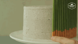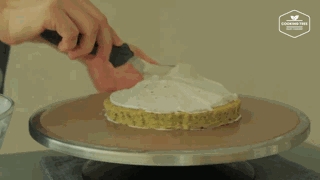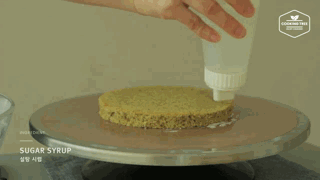 ,将准备好的抹茶海绵胚切成适当的厚度,放在转盘上,涂抹糖浆水!