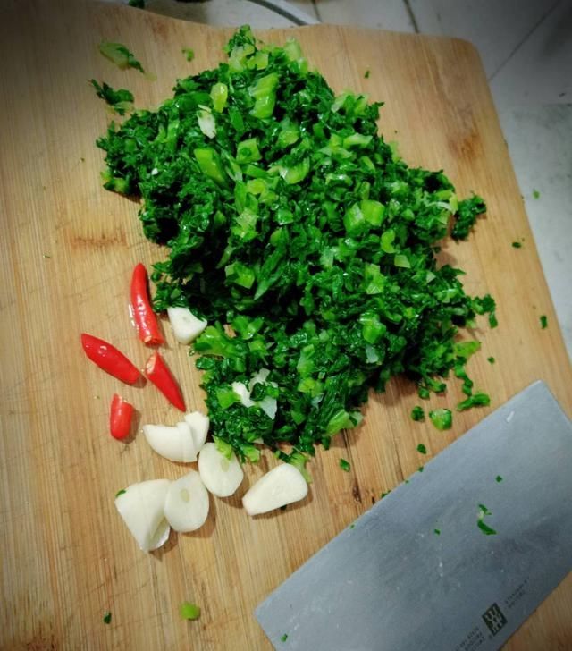 4。用刀子切干莴苣叶,也切大蒜瓣和红辣椒备用。