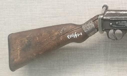 武器本身没有任何标志,如工厂徽章。零件上的编号只是加工编号。要了解更多信息,你必须看看武器的枪托。安装了毛瑟风格的形状和德国风格的带子。枪托的侧面有一个“单元板”。这种“单元板”经常出现在英国轻武器上,所以枪带有一些英国风格。