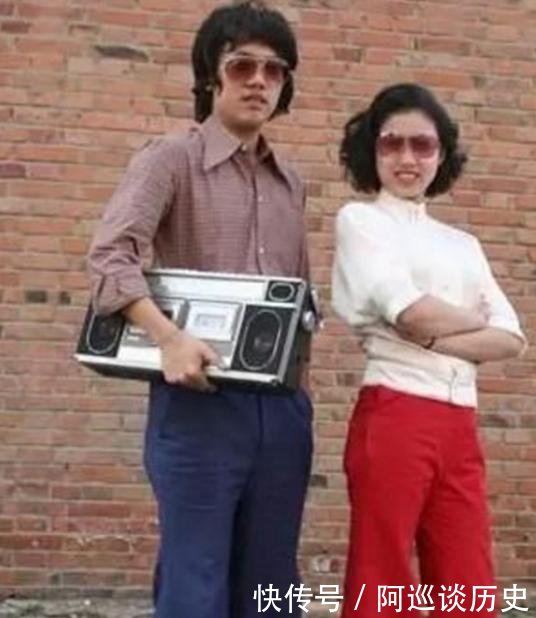 | 20世纪80年代中国历史的老照片:照片显示一对年轻男女穿着非常时尚。蓝色眼镜和喇叭裤是那个时代最流行的服装。然后,一台收音机被拿出来,那是当时的时髦男女。