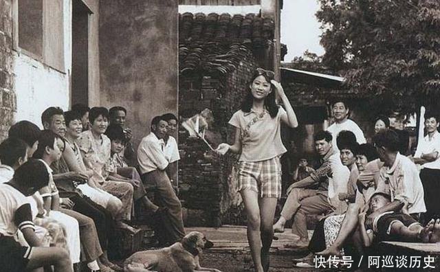 |八十年代中国历史的老照片:一个穿着时髦高跟鞋的年轻女孩走过一群人,吸引了每个人的注意。