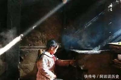 | 20世纪80年代中国历史的老照片:一个村子里的小女孩在厨房做家务,坐在柴炉前的小板凳上烧柴做饭。