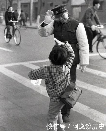 |八十年代中国历史的老照片:1981年,一名尽职的交警在北京西四路口护送一名小学生过马路。戴着红领巾的小学生向交警敬礼并向他们致谢。