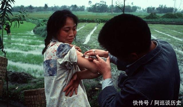 |上世纪80年代中国历史的老照片:图为一名赤脚医生在一个小山村的农场边给一名农村妇女接种卡介苗。