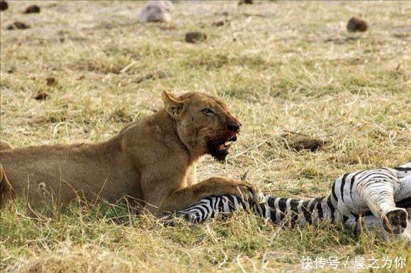 斑马的整个后肢和腹部都被挖空了,只在上肢留下一些肉,但母狮没有放弃。