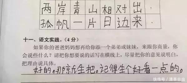 这是一个中国的实际问题,可能是想知道这些学生对第二个孩子的问题是怎么想的毕竟,总是有一些新闻报道说,第一个孩子看到第二个孩子出生,觉得他不再被父母喜欢,所以他背着父母,伤害或欺负他的弟弟或妹妹。这个小学生写的答案仍然是好的。他似乎仍在期待他弟弟或妹妹的出生。然而,出生是有条件的,也就是说,要有一个更漂亮的孩子。看来这个小学生从小就是一个“严孔”。看来等他长大了,他在找女朋友的时候会特别注意颜的价值。