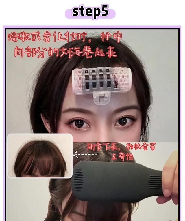 在最后一步中,使用卷发神器或卷发棒将刘海略微卷曲到弧度之外,注意不要卷曲太多,形成自然蓬松的效果
