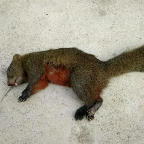 令我的朋友们吃惊的是,当大黄狗回来的时候,他带着一个“礼物”,一具动物的尸体,它看起来像老鼠但不是老鼠,还有一只松鼠但不是松鼠。