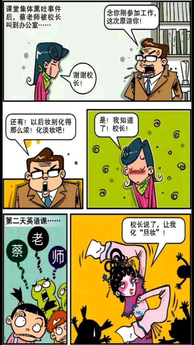 蔡被校长批评了。将来要化淡妆。所以第二天,蔡老师化了妆去上课了。这种理解能力和阿帅一样好!