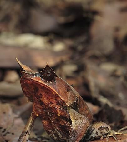 3:生活在东南亚丘陵林地的牛蛙是一种两栖动物,小心翼翼地伪装成树叶。如果不仔细区分,就很难将它与潜在的土壤区分开来。这只青蛙很少走动。它在等待一只兔子,当螃蟹、蜥蜴、小啮齿动物和其他青蛙靠近它时,它会突然袭击并吞食它的猎物。