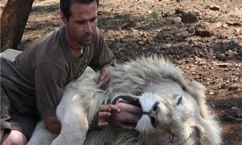 白狮子王肯迪脾气非常暴躁。他曾经伤害过六名教练和守门员。即使是与理查森的第一次会面也差点让理查森受伤。最终花了一年多的时间来训练狮子王。理查森非常熟悉野生动物的习性。他把自己伪装成一头狮子,进入了狮子王剑道的领地。他和他睡了,让狮子王肯迪熟悉他身体的味道,并逐渐融入他们的关系。就这样,他和肯迪相处了一年多。
