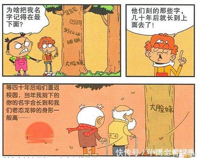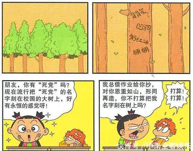 有一天,害怕在高中玩。最近,在学校里流行把好朋友的名字刻在校园的大树上来纪念他们。连大姐觉得这种感觉太好了,太永恒了!她想让阿帅把她的名字刻在校园的大树上,所以她对阿帅说:“我总是把我的作业借给你,然后抄下来。”。我对你太好了,它看起来像一个重建。你不打算把我的名字刻在树上吗?阿帅对大脸妹妹说的话有点惊讶。他不敢拒绝。他对大脸妹妹说,计划!计划!别担心,我会把你的名字刻在校园的大树上!