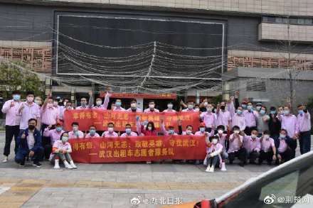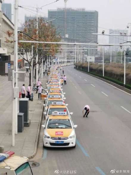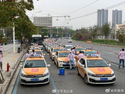 [54辆出租车列队护送中国医疗救护队]湖北武汉加油3月23日上午,在武昌火车站旁边,54辆出租车排队等候,司机更衣了,这是武汉出租车司机自发组织的“护送队”12点,江西韩救护队的大巴车出发了。一路上,54辆出租车分成两队,在大巴两侧护送,13点到达武汉天河机场。(湖北日报)