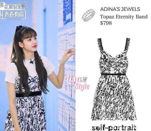 白色t恤和黑色腰带裙。这条腰带裙原本是一件豹纹黑白一体裙。丽莎强行将一件丰满性感的欧美服装融入可爱的风格,与化妆和发饰相得益彰,更显青春活力。当搭配这种有更多线条的打底装时,上衣应该使用像丽莎一样的纯色外套