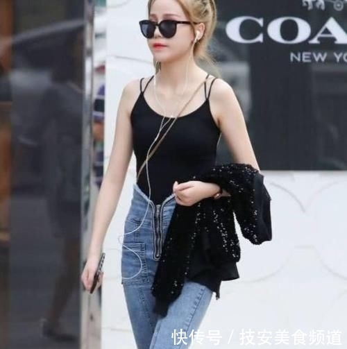 时尚而又洋气的妹妹,梳着简单的辫子,牛仔裤和黑色吊带背心,简洁大方也显腿长,穿着更时尚的女人的美丽身姿,简单就能衬托出美丽的气场