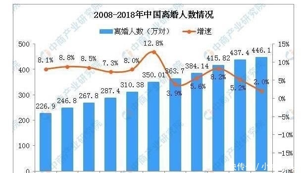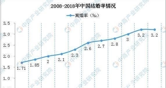 。自2003年以来,中国的结婚率已经连续15年上升,从1987年的0.55‰上升到2018年的3.2‰2008年,离婚数量仅为226.9万,而2018年,有446.1万对夫妇合法离婚,几乎是十年间的两倍。