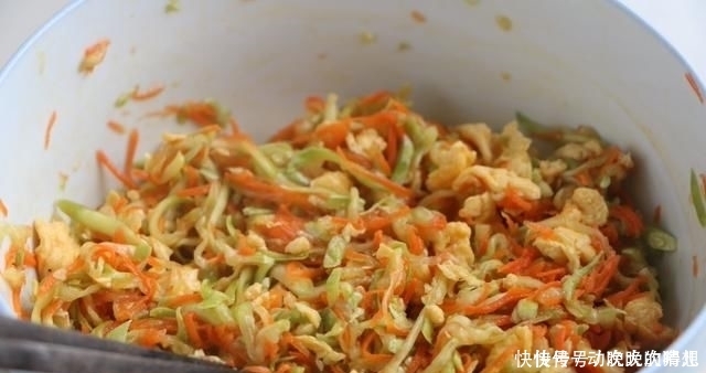 3,腌制西葫芦后,将水挤出放入盆中;胡洛思也做了同样的事情。将鸡蛋敲入碗中,然后倒入锅中油炸。将所有材料放入盆中,加入盐、蚝油、胡椒和熟油,搅拌均匀。